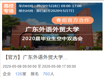3月份以来,伟德bv国际体育已举办了五场广外专场网络视频招聘会(云双选),共有659家用人单位进场招聘,提供岗位数2631个,招聘人数26331人。为缓解新冠肺炎疫情对毕业生就业的压力,学生就业指导中心将继续拓宽毕业生就业渠道,与云就业、前程无忧、智联招聘、猎聘等单位合作举办云宣讲、语音视频面试等线上招聘模式,常态化开展线上招聘活动,并每天发布线上招聘信息。把疫情对就业工作带来的挑战转为机遇,以此为契机,不断促进就业信息化建设,提供优质线上服务,助推毕业生实现更充分更高质量就业。