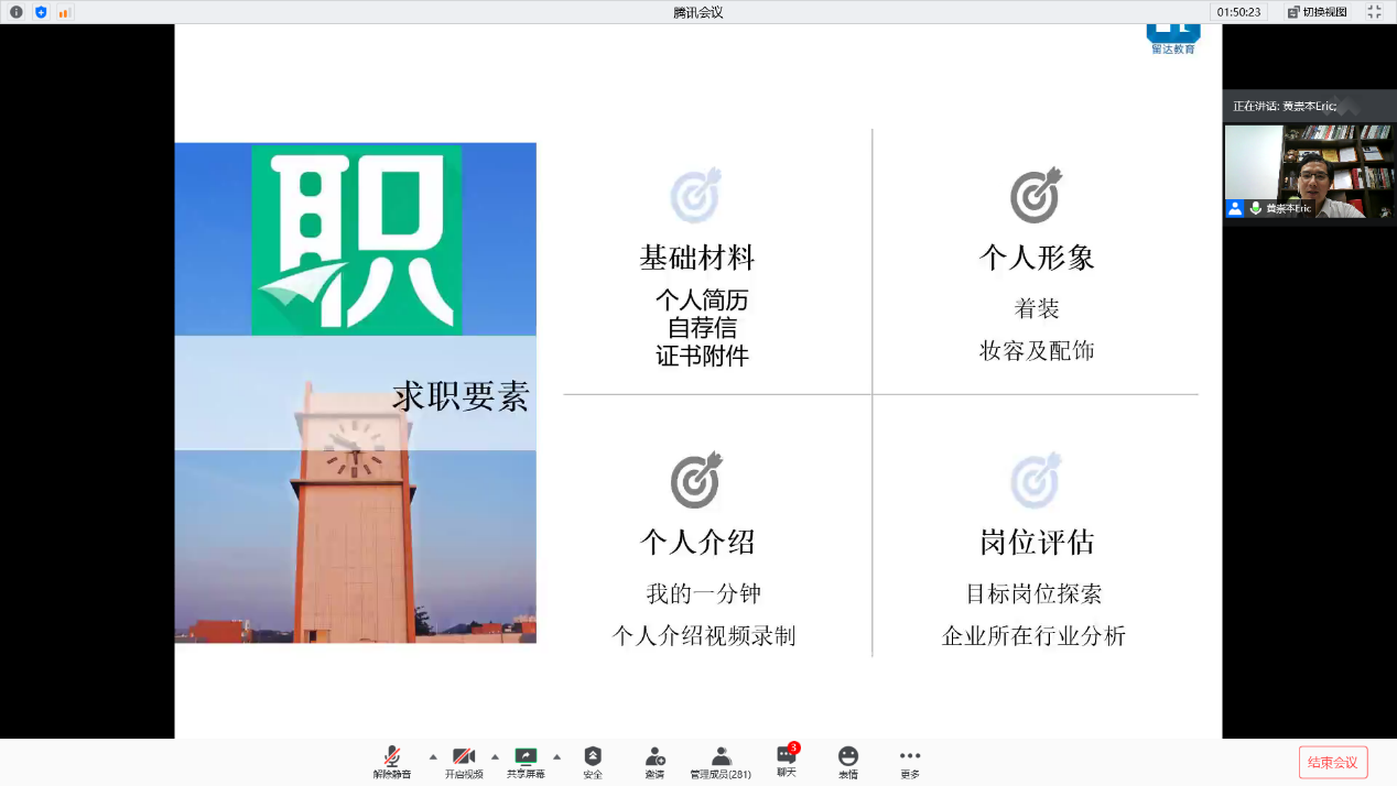校友黄崇本讲述了简历制作和求职面试的基本要素和注意事项,分析了面试时个人形象和着装打扮上的经常被忽视的细节,并建议同学们准备一分钟的自我介绍视频,以便更加从容高效地应对面试。校友庞颖欣提到,在教师应聘中最重要的四项必备能力包括出色的英语能力、扎实的教育心理学知识和应变能力、热切的职业期待以及良好的个人形象,她从惜成长高速期、谦逊勤奋用功、平衡工作生活、重视个人健康等分享了职业心得。校友盛雪结合自身在腾讯的求职经验讲解了面试流程及面试技巧,给予同学们更贴合就业市场需求的指导和建议。