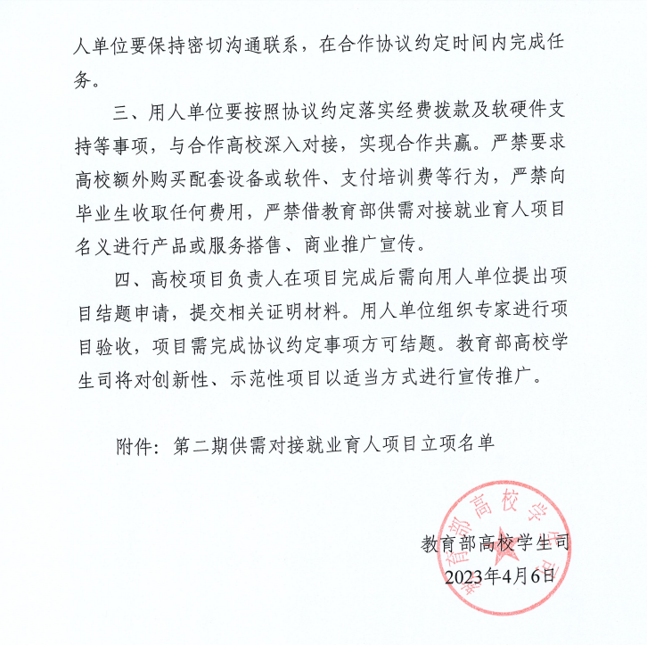 据悉,教育部供需对接就业育人项目是为落实党中央、国务院“稳就业”“保就业”决策部署,深化产教融合、校企合作,推动人才培养与就业有机联动、人才供需有效对接的重要举措。每年发布一次申报通知。