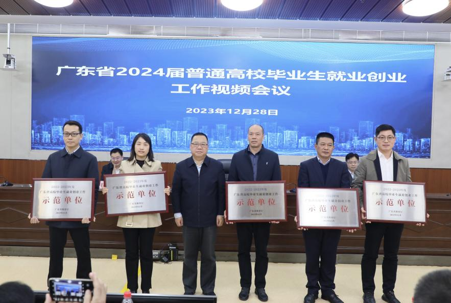 2023年12月28日下午,省教育厅、省人力资源和社会保障厅联合召开广东省2024届普通高校毕业生就业创业工作视频会议,对广东省2024届普通高校毕业生就业创业工作进行动员部署,并为“广东省高校毕业生就业创业工作示范单位”代表颁奖。