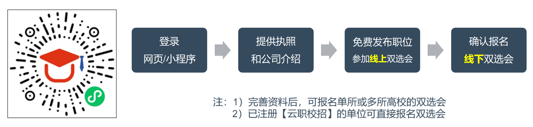 3、单位:免费发布招聘岗位参加所有合作高校线上双选会,线上处理求职信息,精准邀约学生线下到场面试。参会更有目的,面试更有秩序,更高效。