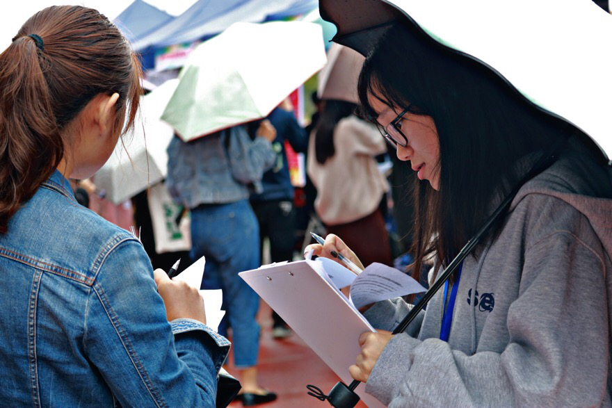 会计学院的彭同学表示此次招聘会的竞争十分激烈,但她对自己今天的面试非常满意,阴雨天气并没有打击到她求职的热情。“我选择心仪的就职单位,第一会看是否符合我的专业,第二个看公司的前景,第三才会看薪酬方面。”而汉语国际教育专业的谢同学择业则更看重自己的兴趣爱好,她倾向于去中小学教育方面的岗位应聘。