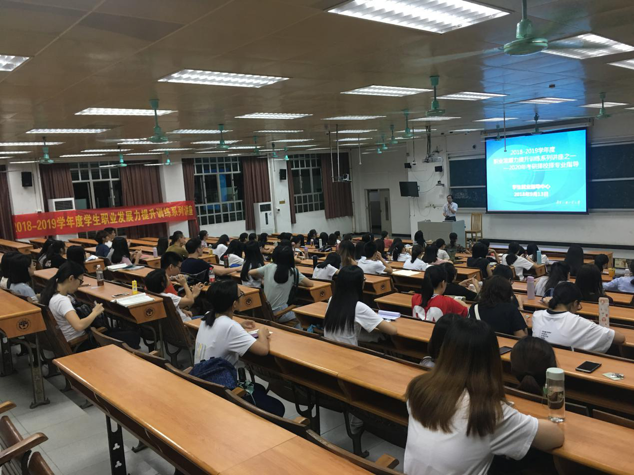2018年9月13日晚,由伟德bv国际体育就业指导中心主办的“2018-2019学年度职业发展力提升训练系列讲座”第一讲分别在南校区教学楼E座503室、北校区第二教学楼219室顺利举行。学生就业指导中心副主任肖锋老师、综合管理与市场信息科科长罗星老师分别主持了南校区和北校区的首场讲座,并为同学们介绍了在个性化求职、专业深造方面可以使用的学生就业指导中心的信息与资源。
