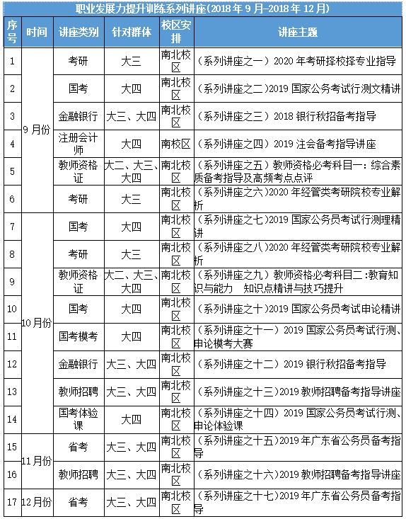 据悉,为了提升毕业生的求职竞争力,更好地满足学生个性化的求职、就业和深造需求,在整合资源的基础上,学生就业指导中心推出了“职业发展力提升训练系列讲座”。本学期将在北校区和南校区围绕不同主题分别举办17场讲座,几乎每周一场。