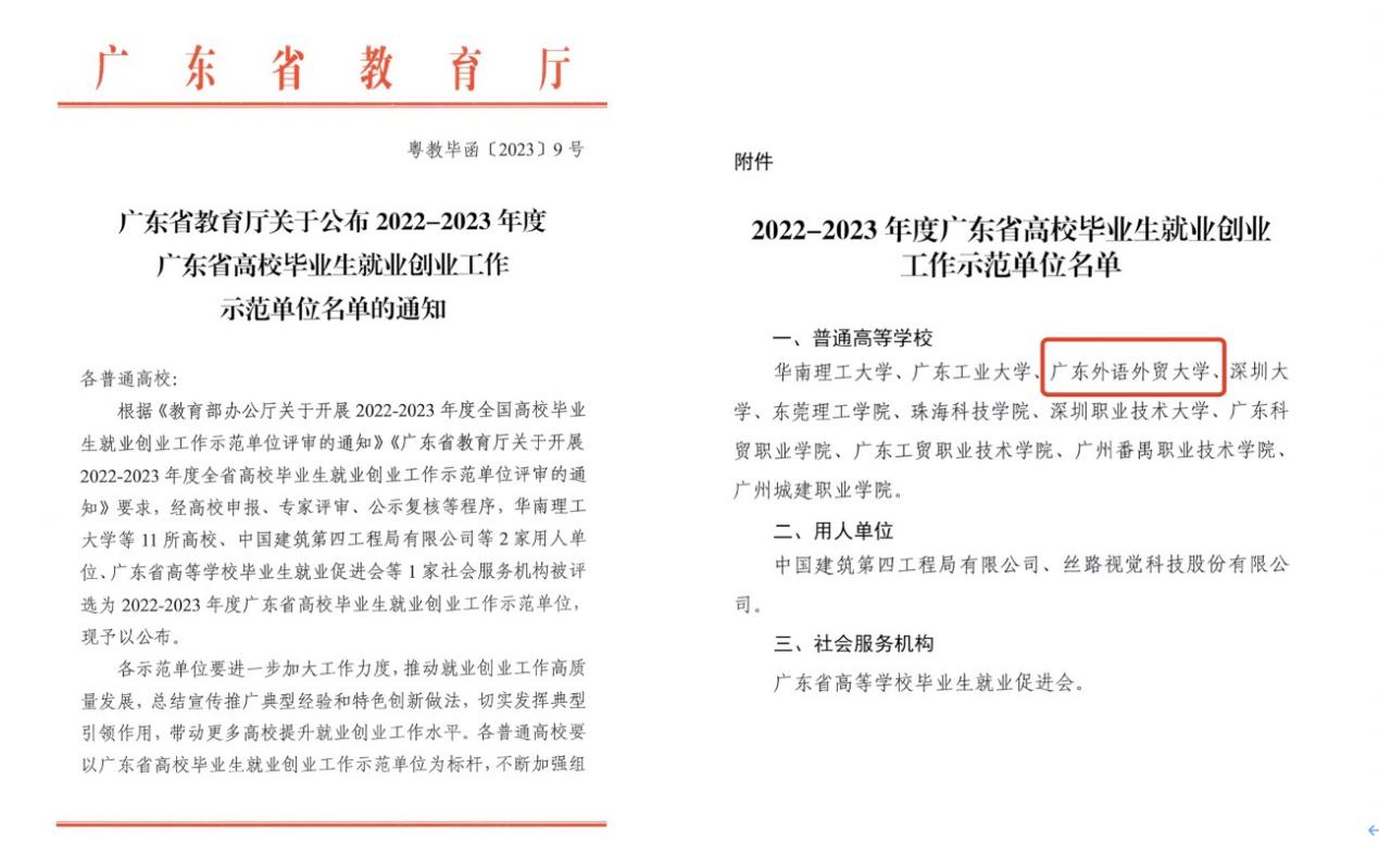 近日,广东省教育厅印发《关于公布2022-2023年度广东省高校毕业生就业创业工作示范单位名单的通知》(粤教毕函〔2023〕9号),伟德bv国际体育被评为“2022-2023年度广东省高校毕业生就业创业工作示范单位”。