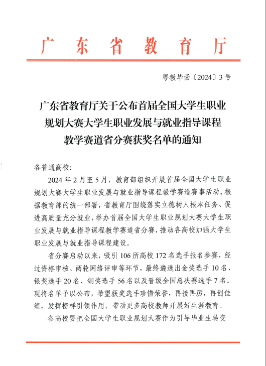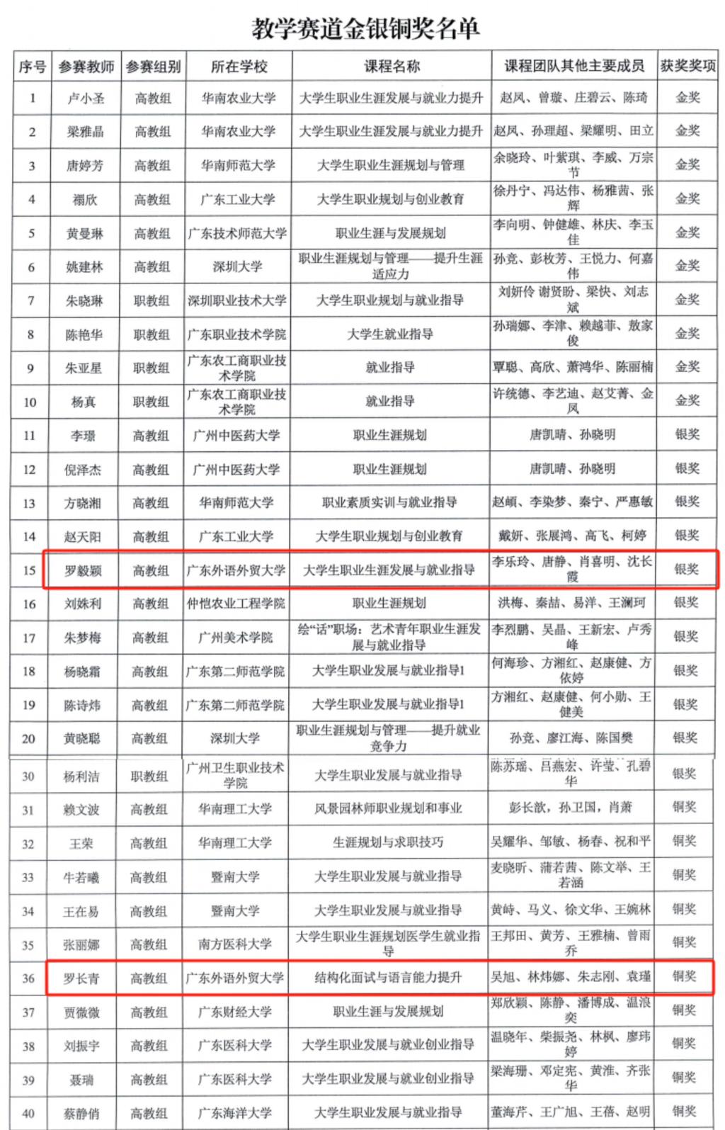 近日,广东省教育厅印发《关于公布首届全国大学生职业规划大赛大学生职业发展与就业指导课程教学赛道省分赛获奖名单的通知》(粤教毕函〔2024〕3号),伟德bv国际体育推荐的两位教师罗毅颖老师和罗长青老师均在省赛获奖,分别获银奖和铜奖。这是继去年伟德bv国际体育就业教育课程入选广东省高校就业创业特色示范课程后,学校职业发展与就业指导课程建设取得的进一步成果。