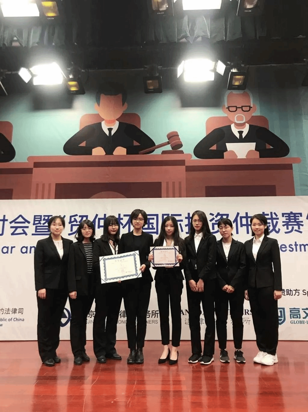从模拟法庭中收获乐趣,郑羽产生了进一步探索的想法。在贸仲杯商事模拟辩论赛结束后,她马上报名参加贸仲杯国际投资仲裁赛,并成为学院参赛队伍的一分子。,虽然已有一次参赛经历,但短短一个月的准备时间,复杂的法律问题仍然让她有些紧张。但回想之前掌握的法律检索和法律运用的基本方法,她静下心来,有条不紊地投入到备赛过程中。功夫不负有心人,学校的参赛队伍最终荣获一等奖——这是历年学院队伍在英文模拟法庭上取得的最好成绩。
