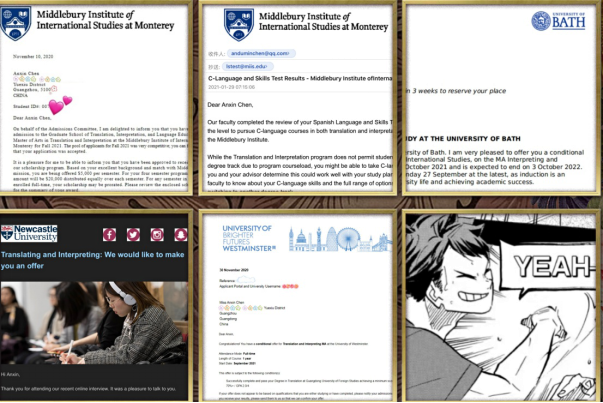 留学申请绝不是一件轻松的事情,需要多年的积累,还要闯过重重关卡,战线也拉得很长,这意味着会面对巨大的压力。陈安昕的申请季开始于大四上学期初,从2020年9月下旬至2021年4月上旬。最终,陈安昕拿到了所有四所梦校目标专业的offer——蒙特雷MATI、巴斯MAIT、纽卡斯尔MAI和威敏MATI。她对广外的老师们满怀感恩之情,特别感谢为她写推荐信的胡正茂教授和欧阳倩华教授——他们一直给予她指点、支持和鼓励。